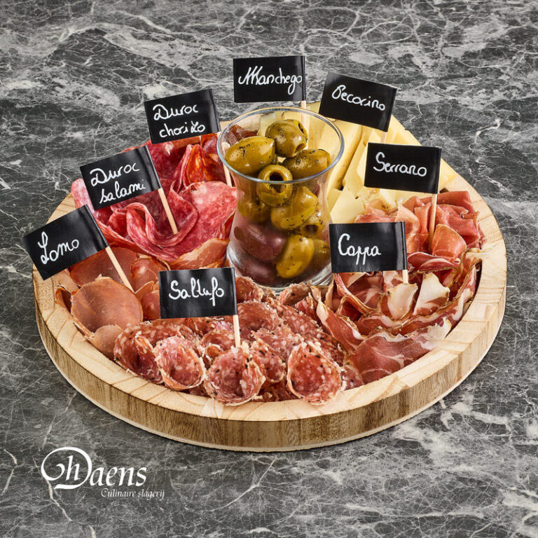 - Duroc chorizo, Duroc pur porc salami, Serranoham, Coppa, Lomo, truffelsalami, Pecorino kaas, Manchego kaas en olijvenmix.